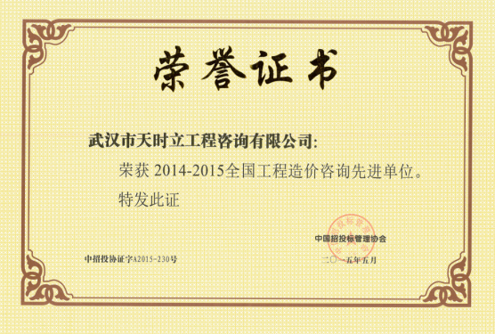 2015年5月,中國招投標管理協會授予我公司“2014-2015全國工程造價咨詢先進單位”。這充分體現了我公司在工程造價領域服務獲得的社會各界和行業的認可和好評,也是對公司全體員工付出努力的肯定。在此,表示熱烈祝賀!