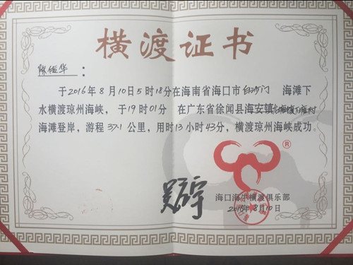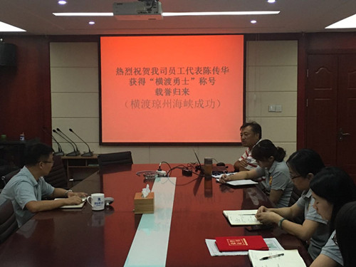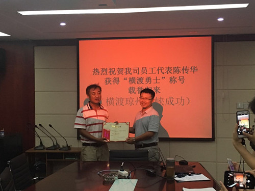 2016年8月10日,我司員工代表陳傳華從海南省海口市海甸區(qū)白沙門海灘下水,13小時43分后,在廣東省徐聞縣龍?zhí)伶?zhèn)下塘村登岸,橫渡瓊州海峽成功,游程37.1公里。海口海牛橫渡俱樂部負(fù)責(zé)人為他頒發(fā)了“橫渡勇士”證書。他是第7位獲得此證書的湖北人,而南北雙向橫渡瓊州海峽的經(jīng)歷,堪稱湖北第一人。載譽歸來,公司也為他頒發(fā)了“優(yōu)秀員工”榮譽證書。