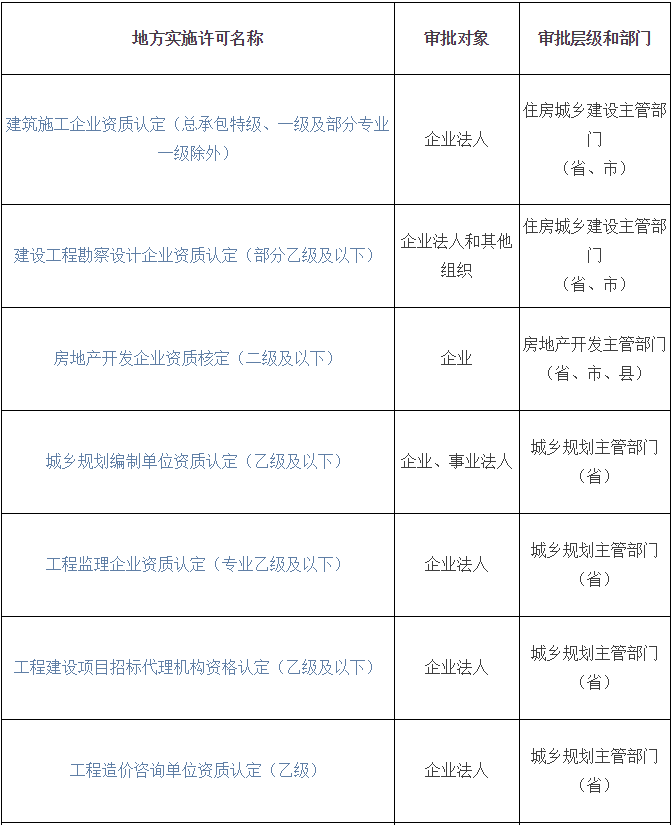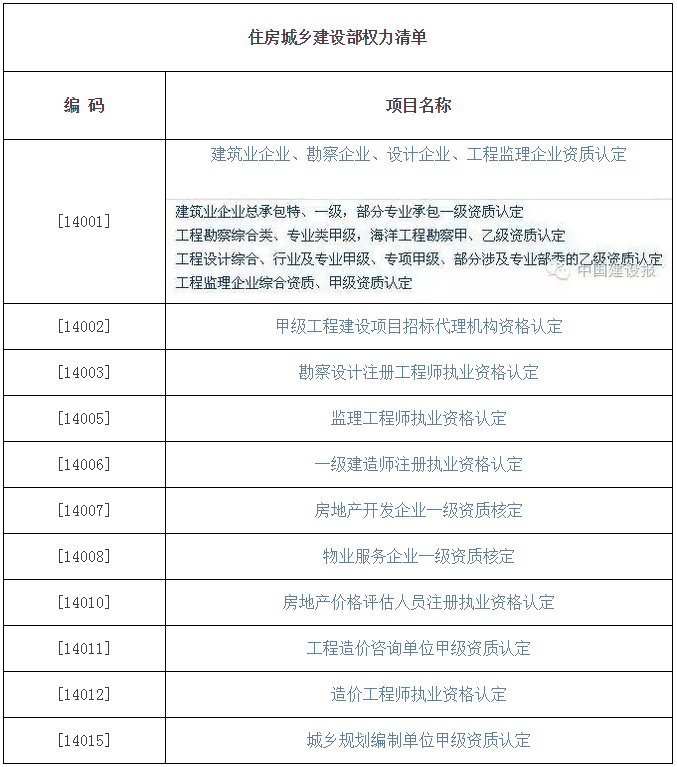 比如甲級工程造價咨詢企業資質、城鄉規劃編制單位甲級資質由國務院住房城鄉建設、規劃主管部門審批等修改內容依據的正是國務院此前發布的政府權責清單以及中央指定地方實施行政許可事項。其中涉及住建部及住建系統清單如下: