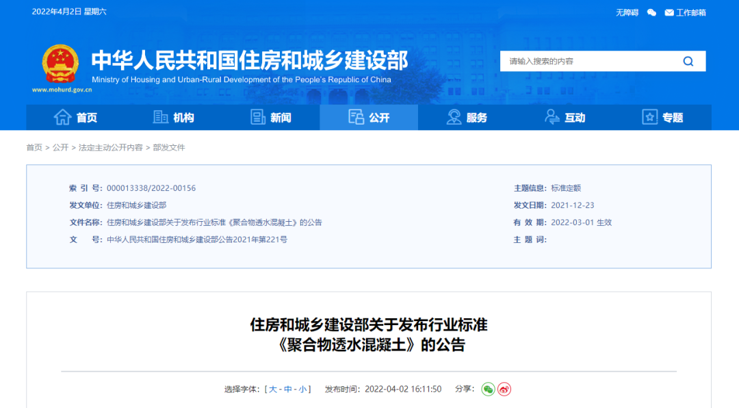4月2日,住建部官網發布公告,批準《聚合物透水混凝土》(CJ/T544-2021)為行業標準。