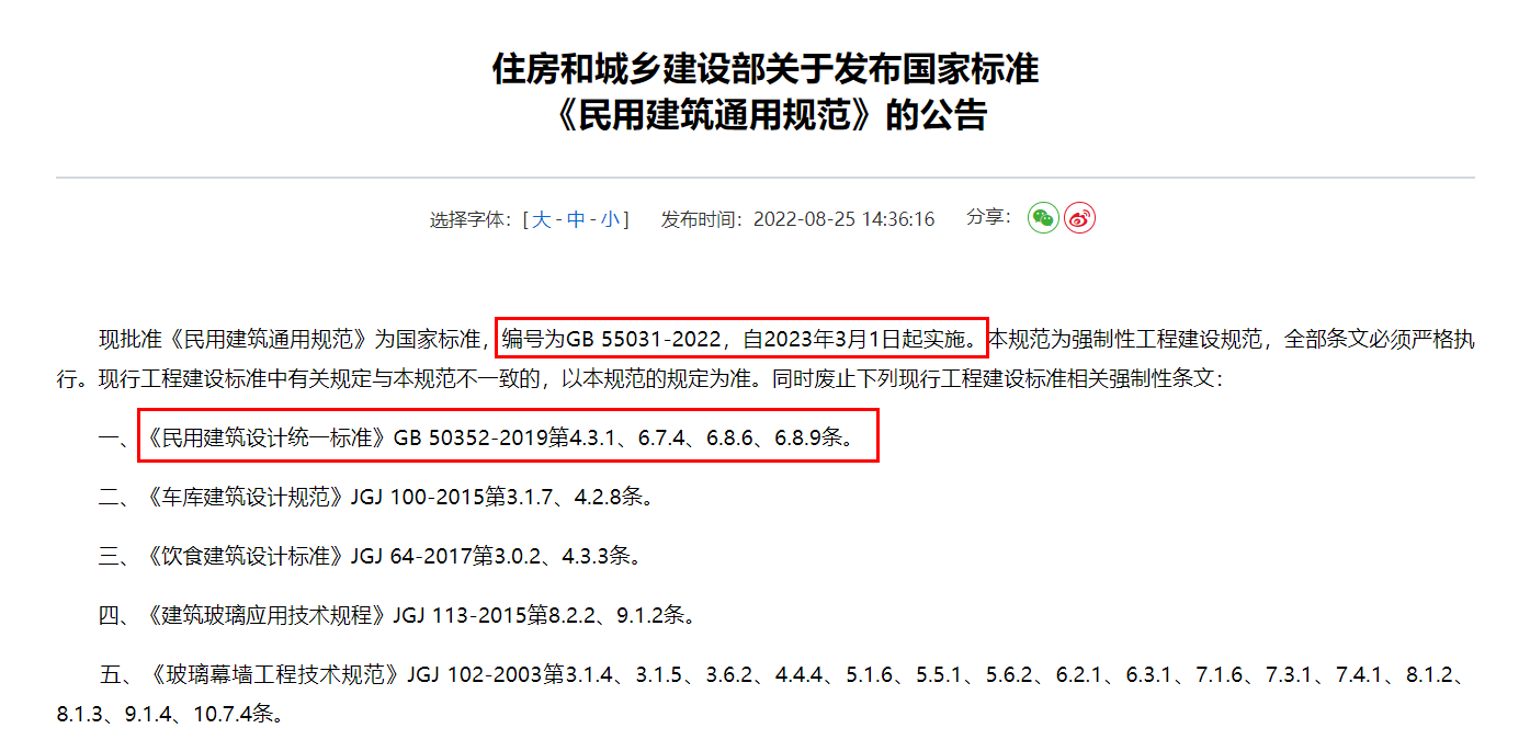 現批準《民用建筑通用規范》為國家標準,編號為GB 55031-2022,自2023年3月1日起實施。本規范為強制性工程建設規范,全部條文必須嚴格執行。現行工程建設標準中有關規定與本規范不一致的,以本規范的規定為準。同時廢止下列現行工程建設標準相關強制性條文...