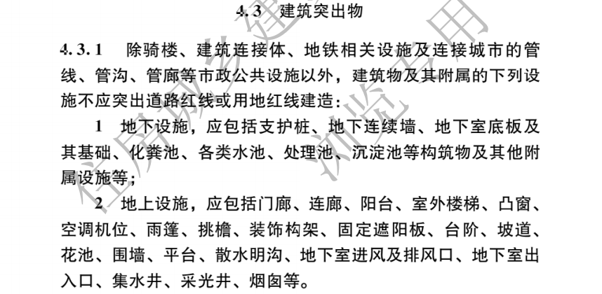 4.3.1除騎樓、 建筑連接體、地鐵相關設施及連接城市的管線、管溝、管廊等市政公共設施以外,建筑物及其附屬的下列設施不應突出道路紅線或用地紅線建造:
