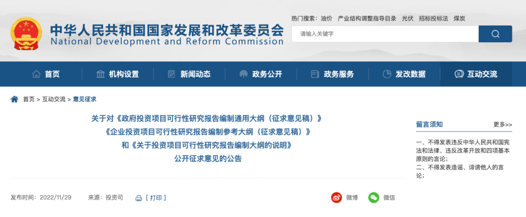 請登錄國家發(fā)展改革委門戶網站首頁“互動交流版塊”,進入“意見征求”專欄,就《政府投資項目可行性研究報告編制通用大綱(征求意見稿)》《企業(yè)投資項目可行性研究報告編制參考大綱(征求意見稿)》和《關于投資項目可行性研究報告編制大綱的說明》,提出寶貴意見建議。
