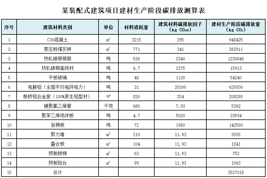 某裝配式建筑項目案例的建筑材料類別與材料消耗量如下表所示,建材碳排放因子根據經第三方審核的建材碳足跡數據與標準附錄D數據計算,可得到建材生產階段碳排放量(kg CO2)。