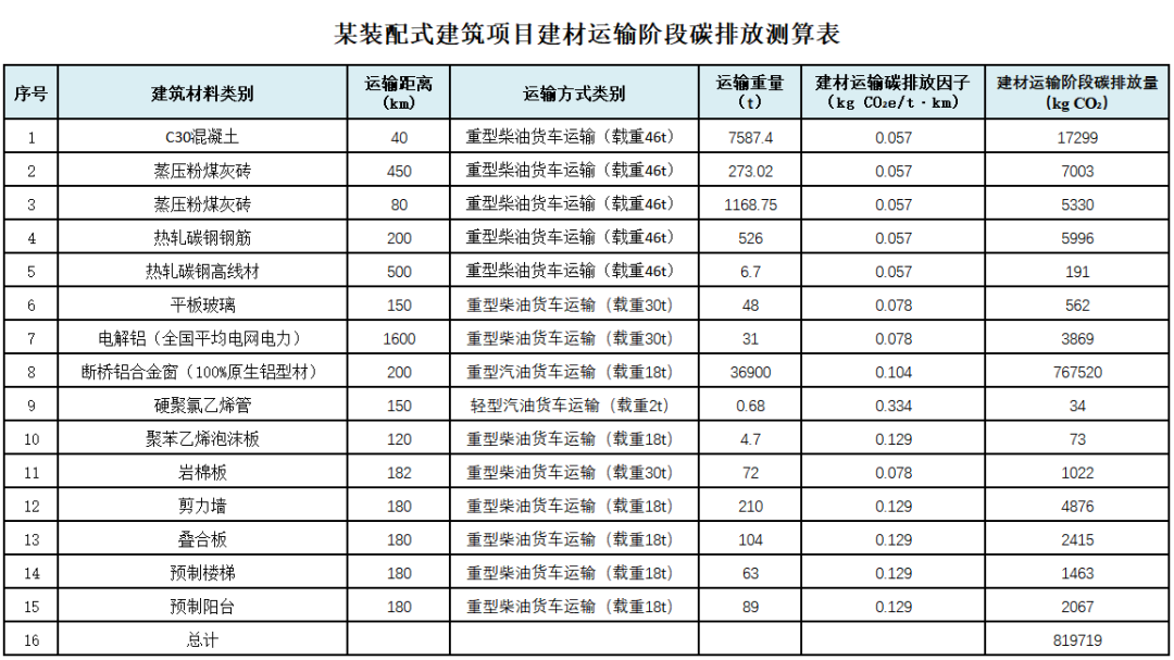 某裝配式建筑項目案例的建筑材料運輸距離、運輸方式、運輸重量如下表所示,建材運輸碳排放因子根據標準附錄E數據計算,可得到建材運輸階段碳排放量(kg CO2)。