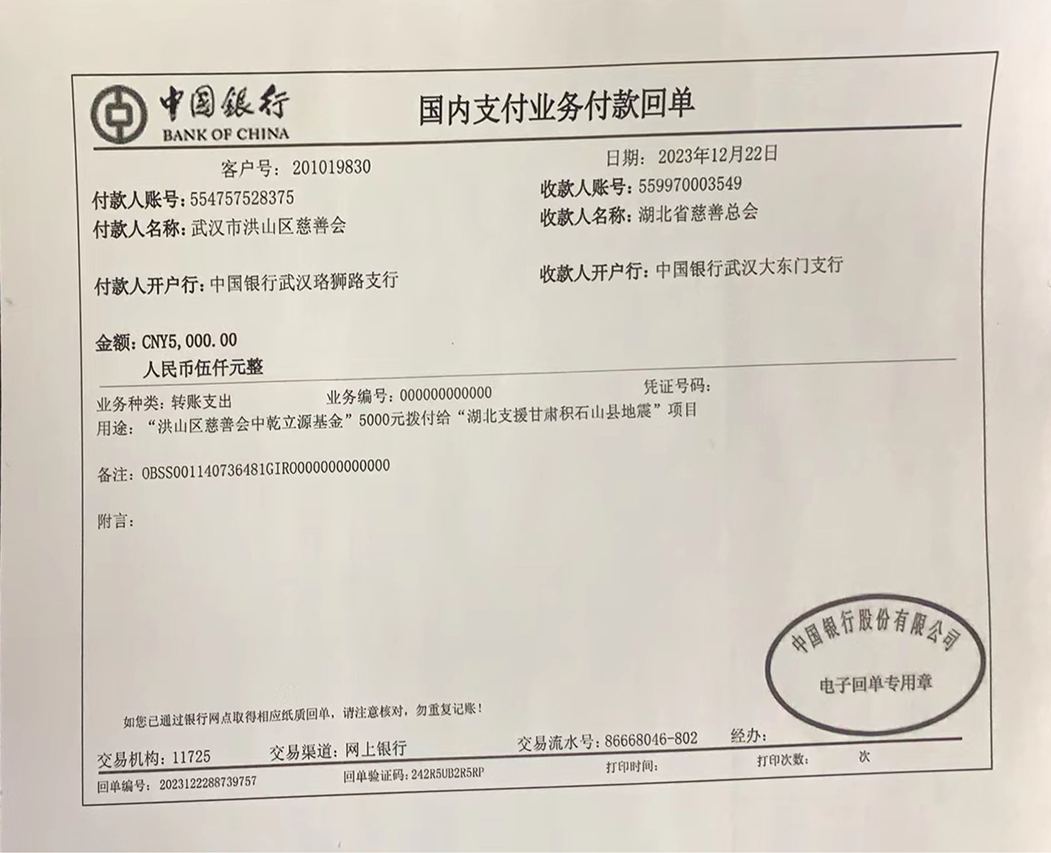 2023年12月22日,中乾立源通過洪山慈善會中乾立源基金向甘肅地震災區捐贈善款。