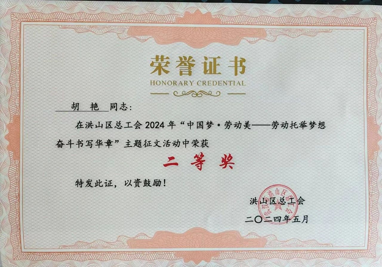 我司員工胡艷憑借其深情力作《“中國夢,勞動美”——平凡英雄》,在洪山區總工會舉辦的“中國夢·勞動美”職工成長成才分享會暨勞模先進事跡宣講會上榮獲二等獎。這不僅是對胡艷個人才華的認可,更是對我司文化內涵及員工精神風貌的高度贊揚。