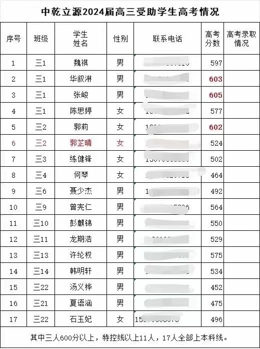 特別值得一提的是,今年——我們助學計劃實施的第十個年頭,萬安中學2024屆高三受助學生在高考中取得了令人矚目的成績。在我們的支持下,他們不負韶華,勇敢追夢。其中,三人高考成績突破600分大關,展現了卓越的學習能力和不懈的奮斗精神;更有11名同學超過特控線,這意味著他們向著更高學府邁出了堅實的一步。最為振奮的是,所有17名受助的高三學生,無一例外,全部達到了本科錄取分數線,實現了人生的又一次飛躍。