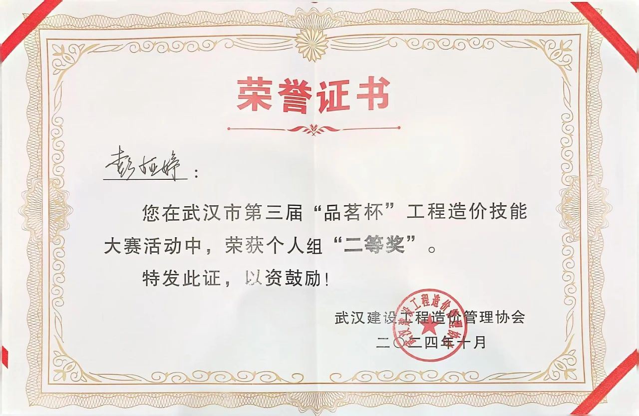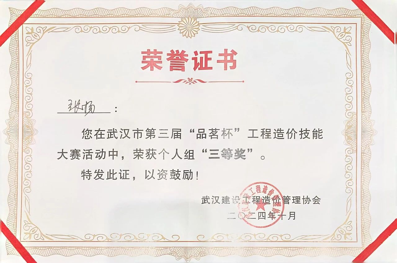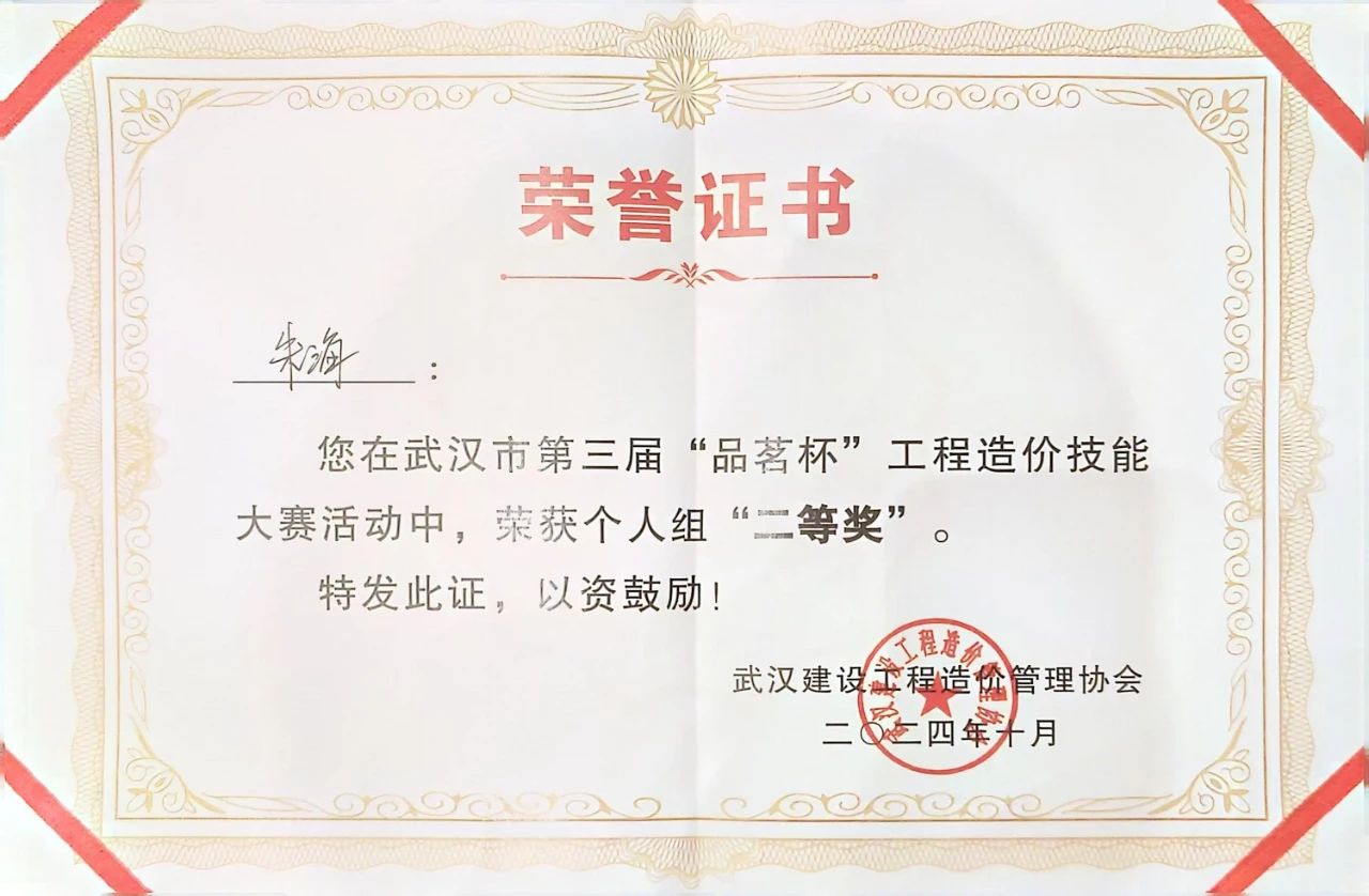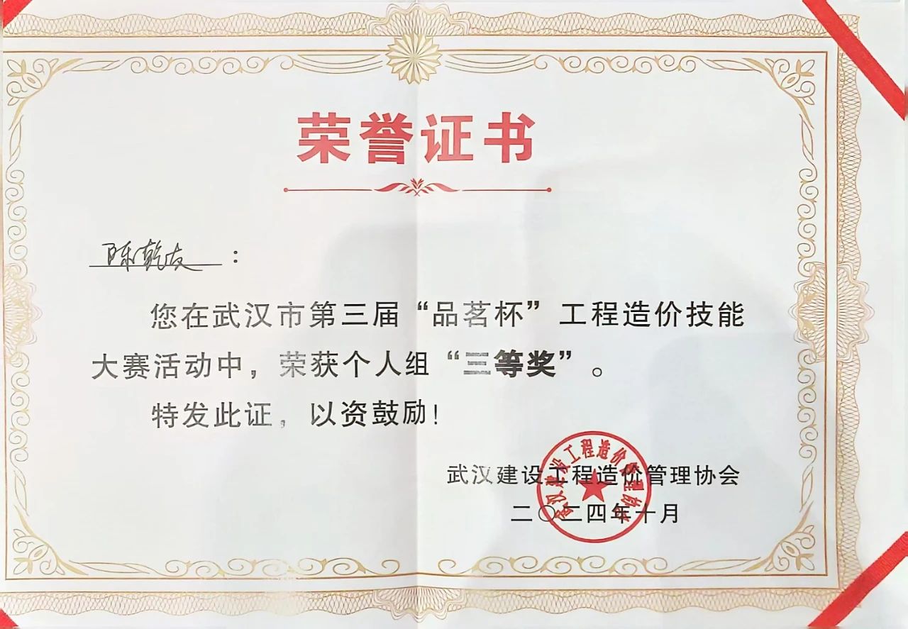 熱烈祝賀中乾立源工程咨詢有限公司榮獲武漢市第三屆“品茗杯”工程造價技能大賽“團體三等獎”,員工朱海、彭婭婷榮獲個人二等獎,張楊、陳乾友,榮獲個人三等獎,吳時宇、管弄簫、禹霄、張瑋榮獲“個人優秀獎”。