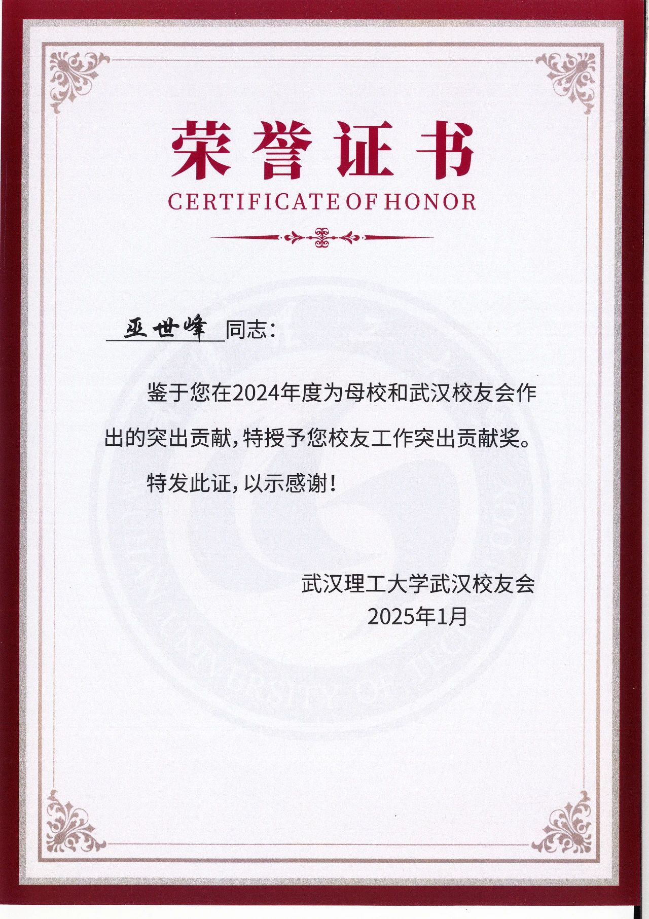 下午的新春年會同樣精彩紛呈。武漢理工大學黨委副書記孟芳兵、武漢校友會會長李葉青等領導嘉賓紛紛致辭,表達了對校友事業發展的深切關懷和支持。會議期間還頒發了多項榮譽獎項,表彰在過去一年里表現突出的校友企業和個人。其中,巫世峰董事長榮獲了“2024年度校友工作突出貢獻獎”,以肯定其長期以來對校友工作的支持和付出。