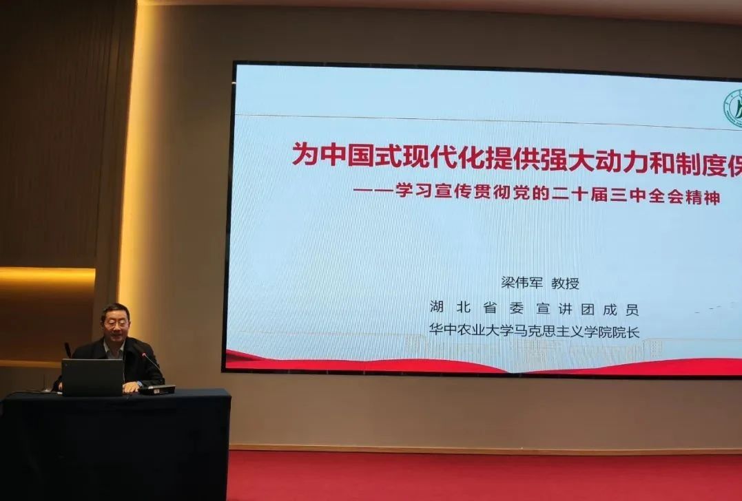 梁偉軍教授以《為中國式現代化提供強大動力和制度保障——學習宣傳貫徹黨的二十屆三中全會精神》為主題,從多個角度深入剖析了三中全會的核心內容及其深遠影響。通過引用華中農業大學最新的科研成果如“長在樹上的茄子”和“新品草莓番茄”的實例,梁教授生動地闡述了科技創新與產業創新相結合的重要性。接近兩小時的精彩演講讓參會者深受啟發,大家紛紛表示收獲頗豐。
