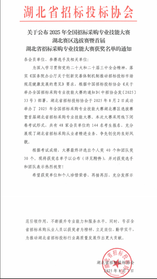 近日,由湖北省招標投標協會主辦的2025年全國招標采購專業技能大賽湖北賽區選拔賽暨首屆湖北省招標采購專業技能大賽圓滿落幕。中乾立源在激烈競爭中脫穎而出,榮獲集體二等獎,公司員工巫世育、王純同時斬獲個人優秀獎。