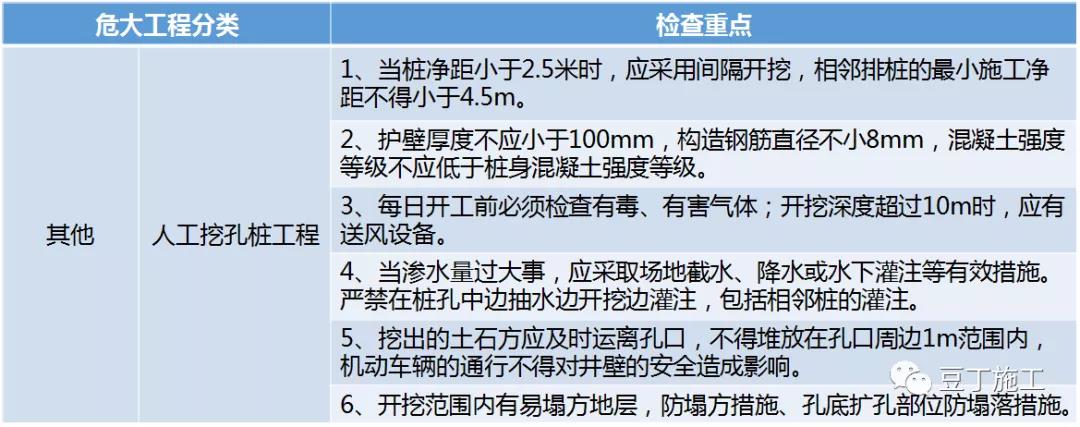 5.檢查要求:人工挖孔樁工程主要材料進場質量檢查、抽檢,過程中對照專項施工方案有關檢查內容等。