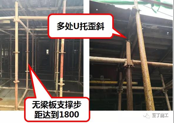 板底模架搭設不規范,架體缺失水平桿,步距過大,U托自由端長度超標、U托歪斜。