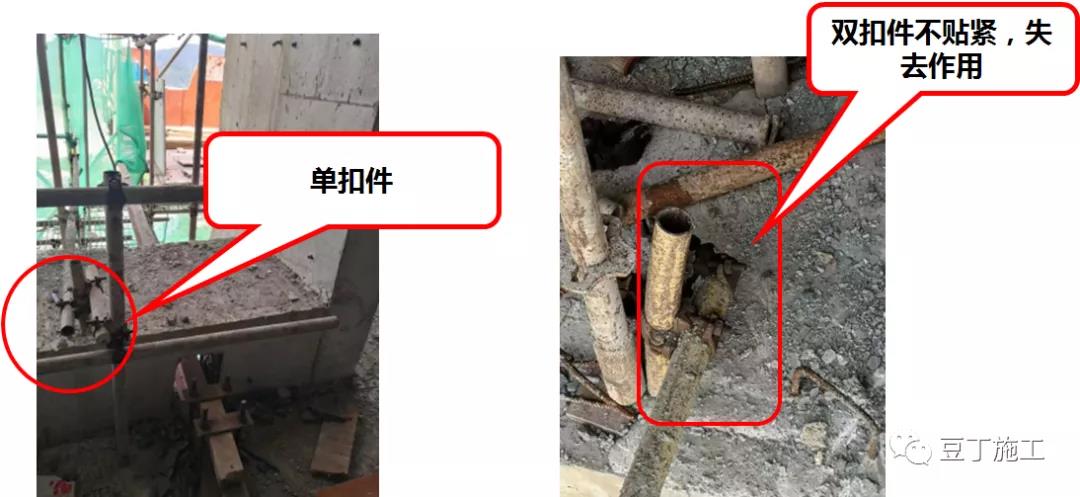 采用預埋短鋼管的連墻件,不按方案設置雙扣件,或雙扣件設置不合理。