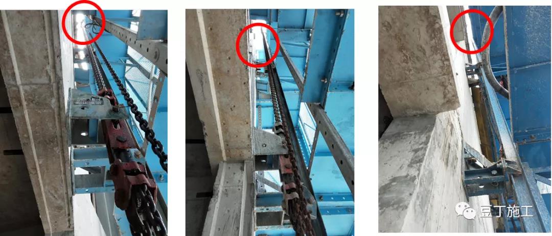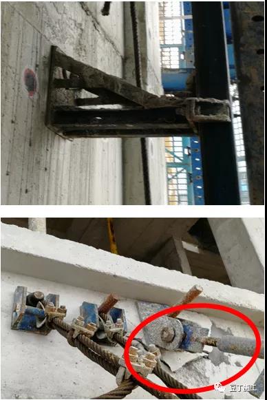 鋼絲繩使用不規范:采用卸扣和拉環拉結、共用拉環、用一根繩對折使用、與結構摩擦無隔離。