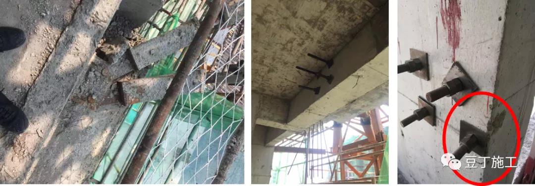 附著預埋螺桿數量與方案不符,方案為六根螺桿,實際為四根。附著螺栓邊緣混凝土太薄,不能有效固定附著支座