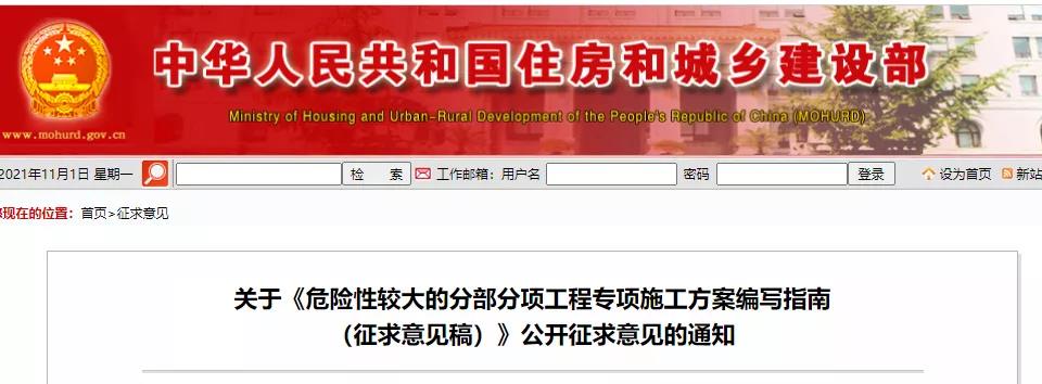 2021年11月1日,住建部官網發布《危險性較大的分部分項工程專項施工方案編寫指南(征求意見稿)》。