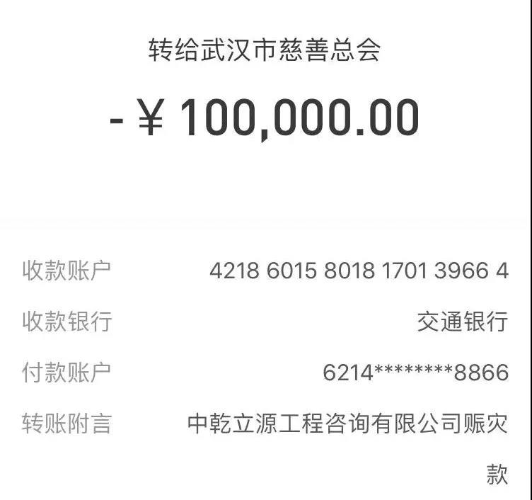 1月23日上午10點,武漢市公共交通系統(tǒng)暫停運(yùn)營,機(jī)場、火車站離漢通道關(guān)閉,路上行人稀少,市民大都不再外出,避免感染。在這種嚴(yán)峻的形勢下,中乾立源積極響應(yīng)黨支部號召,董事長巫世峰攜夫人冒著被傳染的風(fēng)險,堅持在第一時間前往武漢市慈善總會,以公司名義捐贈人民幣10萬元,以支持抗擊疫情,展現(xiàn)了民營企業(yè)勇于肩負(fù)社會責(zé)任的精神。