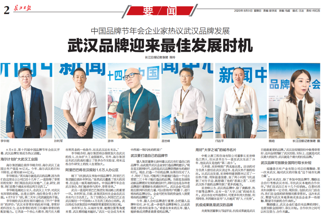 “2020年8月8日,以“賦能與重振”為主題由中國品牌聯盟、中共武漢市委、武漢市人民政府聯合主辦的2020(第十四屆)中國品牌節年會在武漢盛大開幕。”