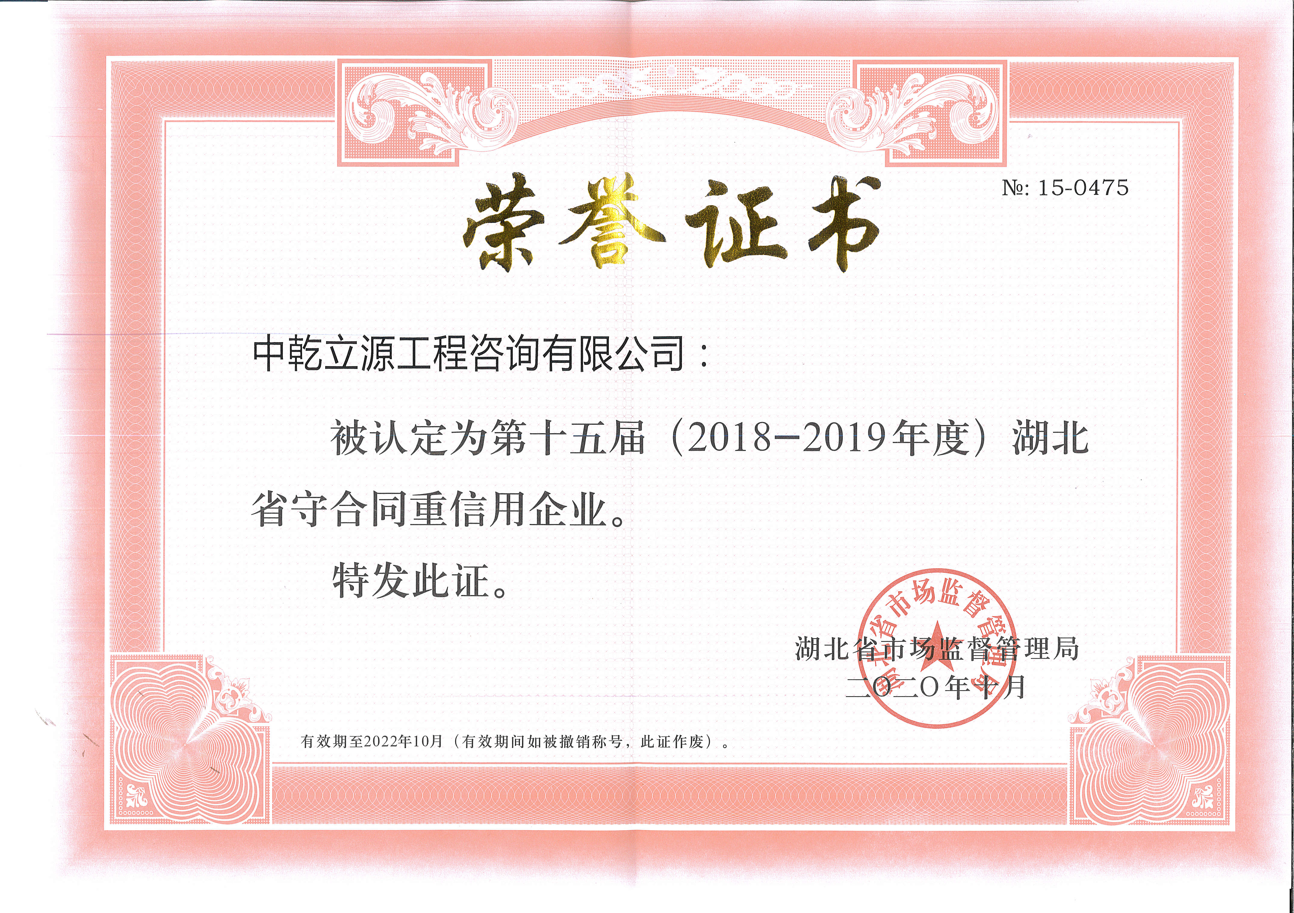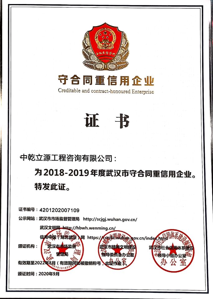誠實(shí)守信,依法經(jīng)營,有效地促進(jìn)了企業(yè)發(fā)展。經(jīng)武漢市場(chǎng)監(jiān)督管理局、湖北省市場(chǎng)監(jiān)督管理局的層層推薦和嚴(yán)格審查、考評(píng),中乾立源工程咨詢有限公司再次獲得了“第十五屆湖北省守合同重信用企業(yè)”和“2018-2019年度武漢市守合同重信用企業(yè)”兩個(gè)榮譽(yù)稱號(hào)。