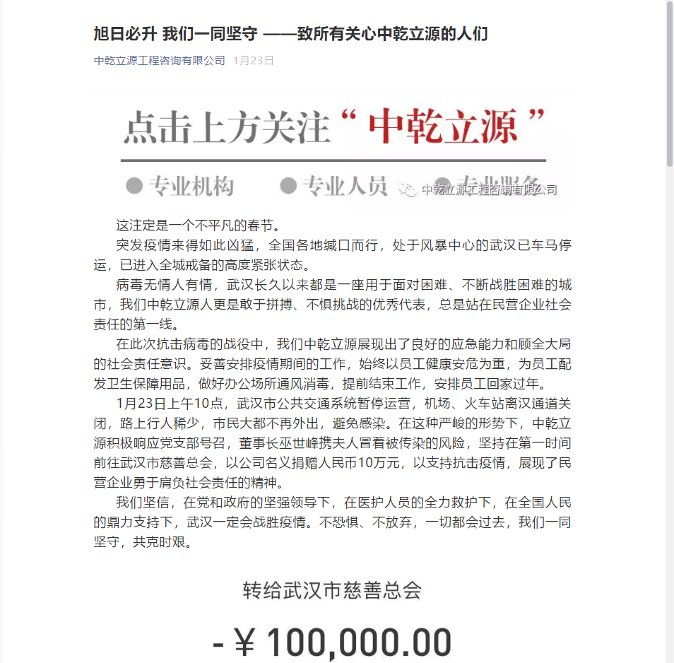 在這種嚴峻的形勢下,中乾立源積極響應黨支部號召,董事長巫世峰攜夫人冒著被傳染的風險,堅持在第一時間前往武漢市慈善總會,以公司名義捐贈人民幣10萬元,以支持抗擊疫情,展現了民營企業勇于肩負社會責任的精神。