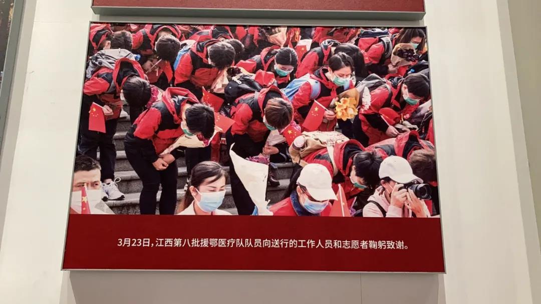 來自江西援鄂的醫療隊,向送行的工作人員和志愿者鞠躬致謝,送行隊伍中,也有老家在江西的巫總的身影。